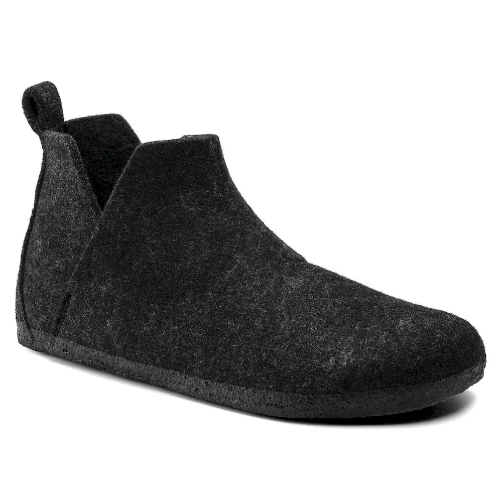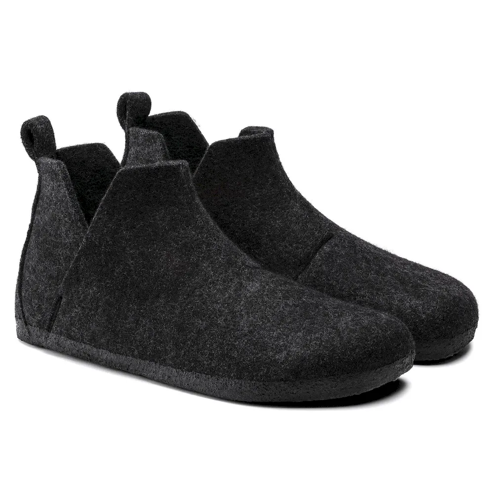 The BIRKENSTOCK Andermatt is the perfect slipper boot. Ankle height and extra cozy, featuring a shearling lined footbed and a pull tab for easy on and off. Stay snug even on chilly evenings. The upper is made from soft wool felt.