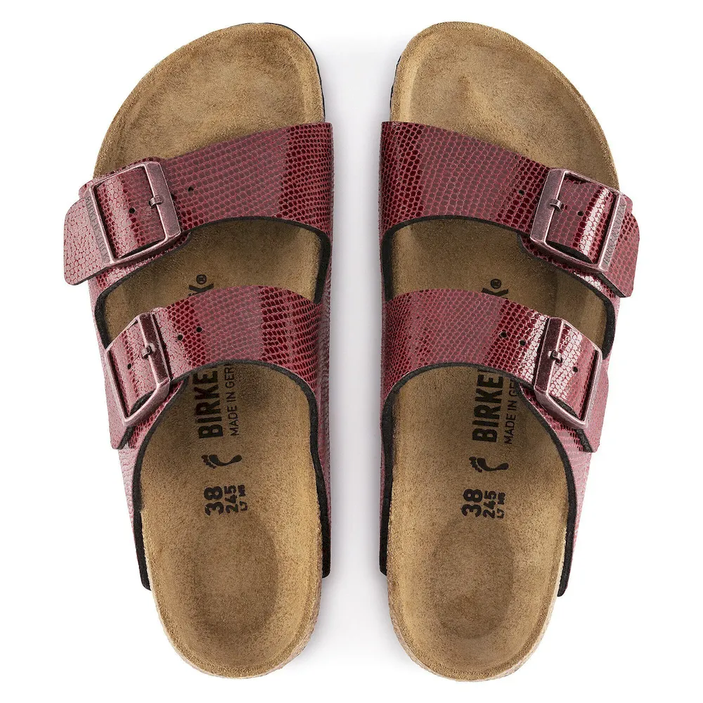 The legendary two-strap design from BIRKENSTOCK – the Arizona. Iconic style with the signature comfort of the BIRKENSTOCK footbed. Shown in a glossy, metallic snake-patterned Birko-Flor®.