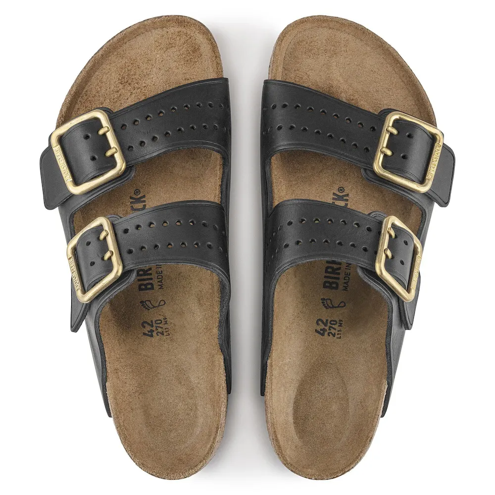 The legendary two-strap design from BIRKENSTOCK – the Arizona. Iconic style with the signature comfort of the BIRKENSTOCK footbed. This modern version of our classic Arizona features a double prong brass tonal buckle and a high traction rubber outsole. The cushioning midsole made from EVA promotes stability and comfort. Made of premium leather with edge embossing