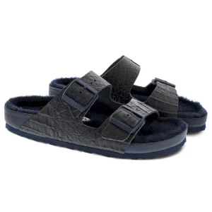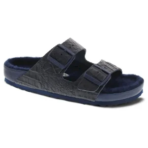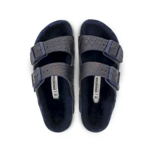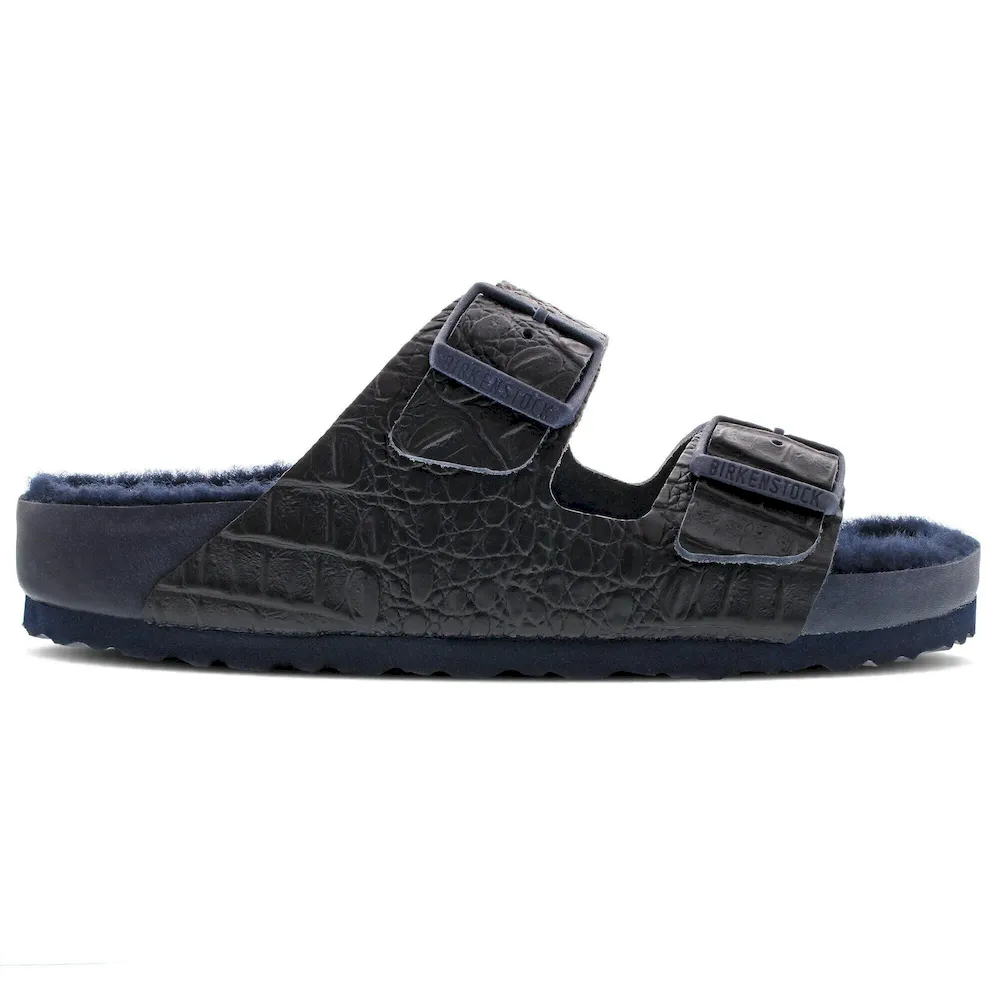 The BIRKENSTOCK Arizona is a true classic that has inspired for decades with its timeless design. This version is a stylish limited edition, featuring croko embossed leather straps and navy buckles. It takes a step further with a soft genuine shearling lining on the anatomically formed cork latex footbed. The genuine shearling lining on the footbed exudes style and keeps feet warm. The sandal can be individually adjusted to the wearer’s feet using the two metal pin buckles in a vintage look. This ensures an excellent fit.