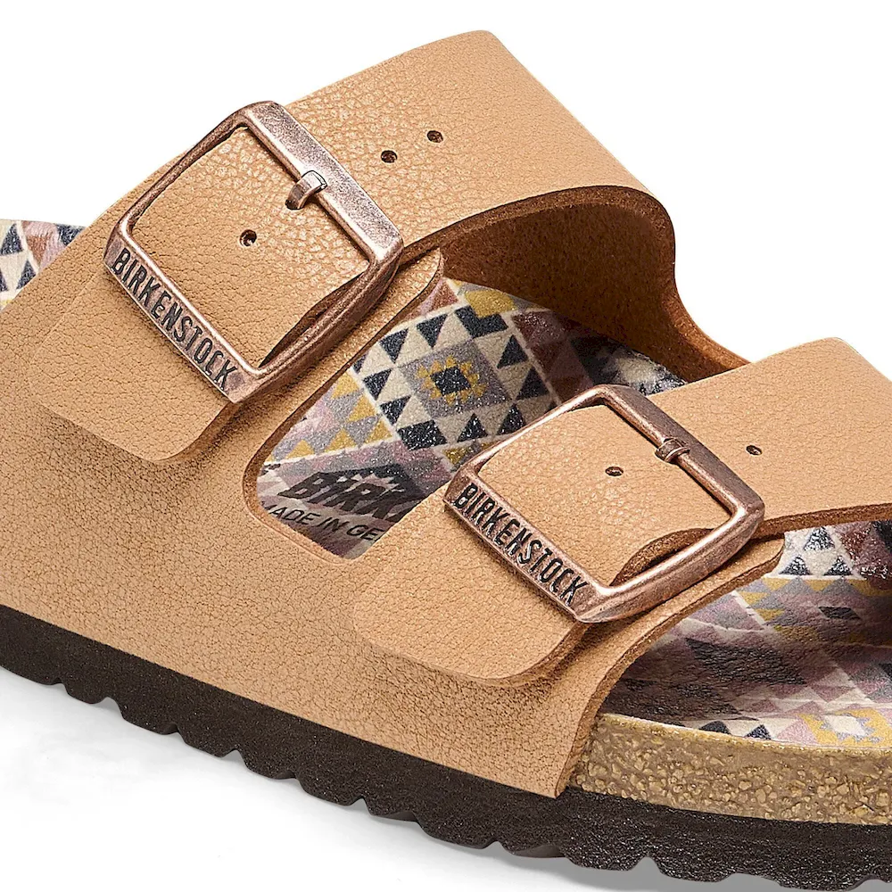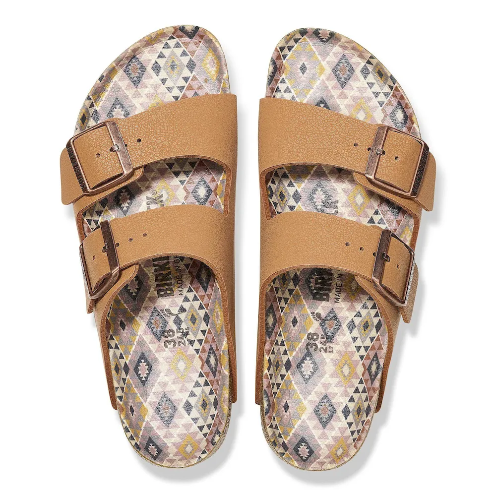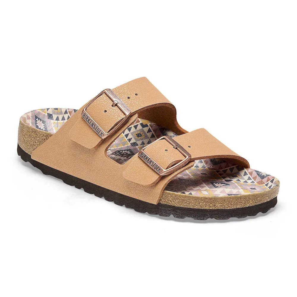 An icon of timeless design and legendary comfort, the Arizona sandal has been defining style since 1973. This season, the sandal goes vegan with a smooth Birkibuc upper and microfiber footbed lining. A boho-inspired geometric print adds a surprise pop to the contoured footbed, designed to shape to you for custom support.
