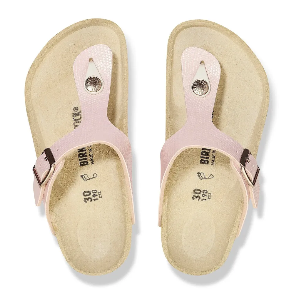 The BIRKENSTOCK Gizeh is a genuine classic that combines optimum grip with fashionable design to really turn heads at school. This version comes in a shiny lizard design and exudes elegance and a touch of extravagance thanks to the iridescent metallic foil and the reptile skin look. Inspired by nature, no two shoes have the same look and feel. The upper is made from the skin-friendly, hard-wearing synthetic material Birko-Flor®, which has been embossed.
