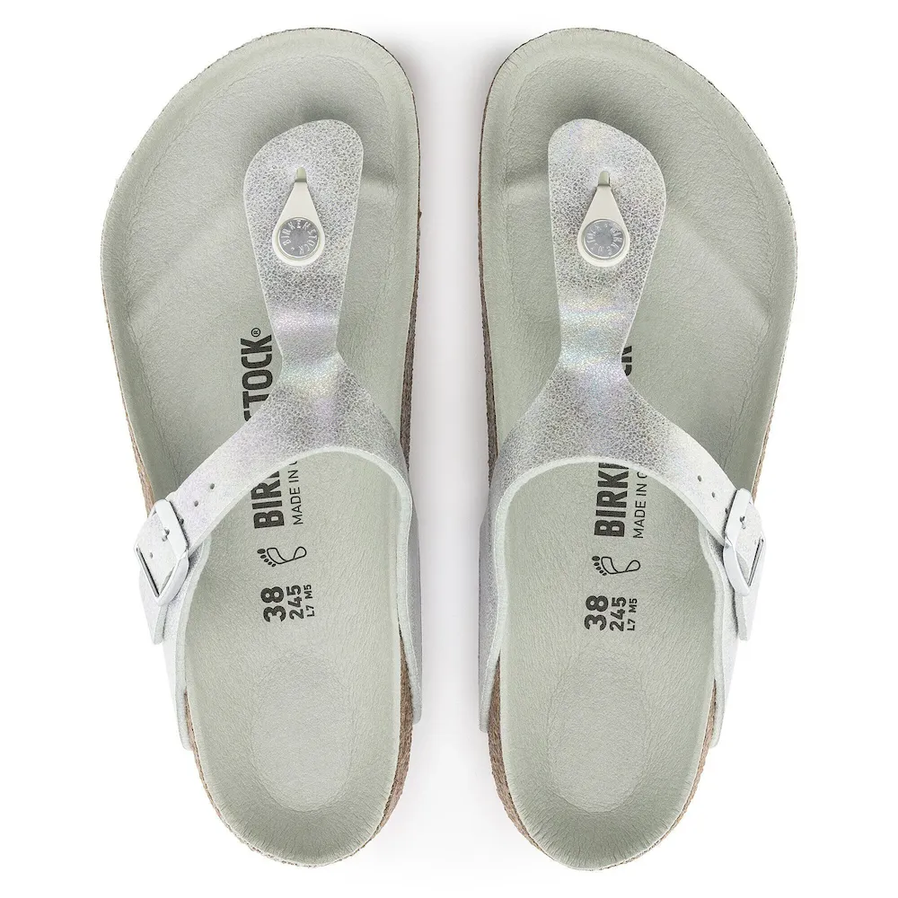 The BIRKENSTOCK Gizeh brings legendary comfort and elegant detailing to the thong sandal. This spring, Iridescent Matcha catches the light wherever you wander, with tonal details that match back to the soft shade. With a vegan microfiber upper and footbed lining for style you’ll love inside and out. Complete with an original BIRKENSTOCK cork-latex footbed for all-day support.