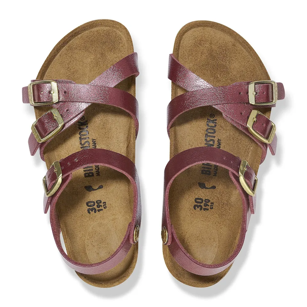 The Kids’ Kumba sandal, shined up to catch the sun. Smooth Birko-Flor® brings shimmer to their style, with an ankle strap for added security and a fit that’s just right. Complete with an original BIRKENSTOCK® footbed to support them through days of play.