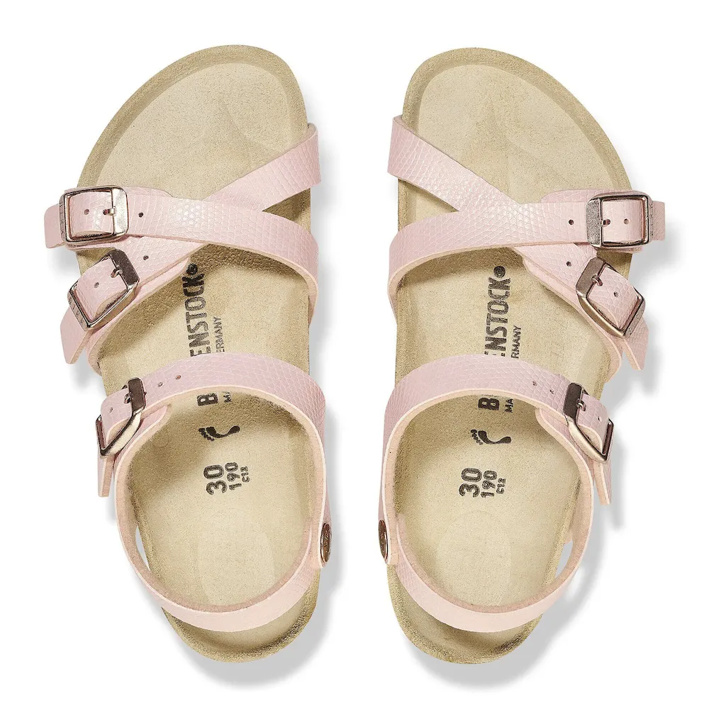 The Kids’ Kumba sandal, shined up to catch the sun. Embossed Birko-Flor® brings shimmer to their style, with an ankle strap for added security and a fit that’s just right. Complete with an original BIRKENSTOCK® footbed to support them through days of play.