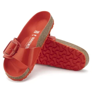 The original BIRKENSTOCK Sandal. A strap, a buckle, and a contoured cork footbed are masterfully combined to create the Madrid. An iconic slide with an amplified buckle accent. The semi-exquisite footbed is fully lined with soft piumato leather, making it exceptionally comfortable. The upper is made from high-quality natural leather with a high shine finish.