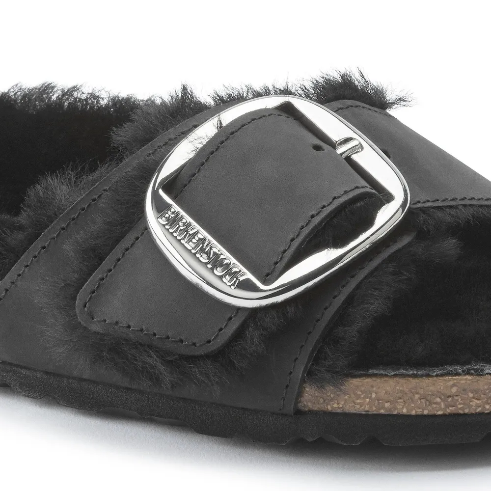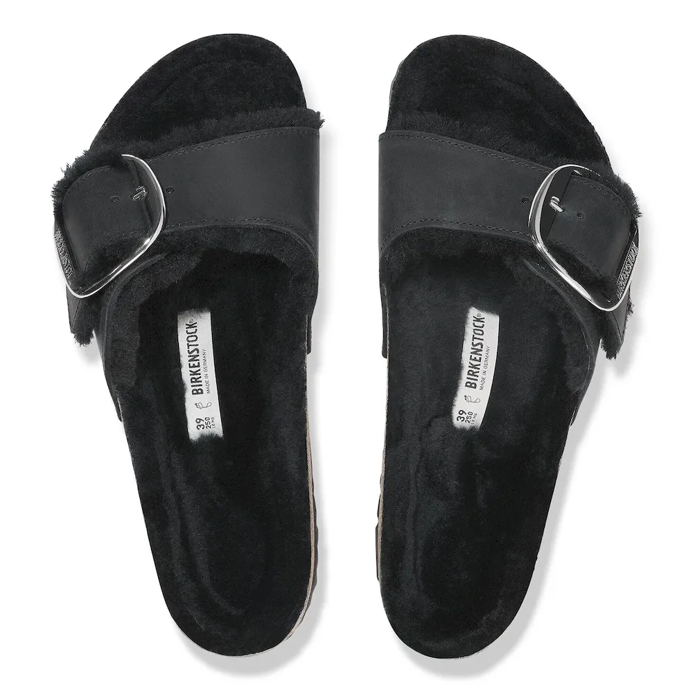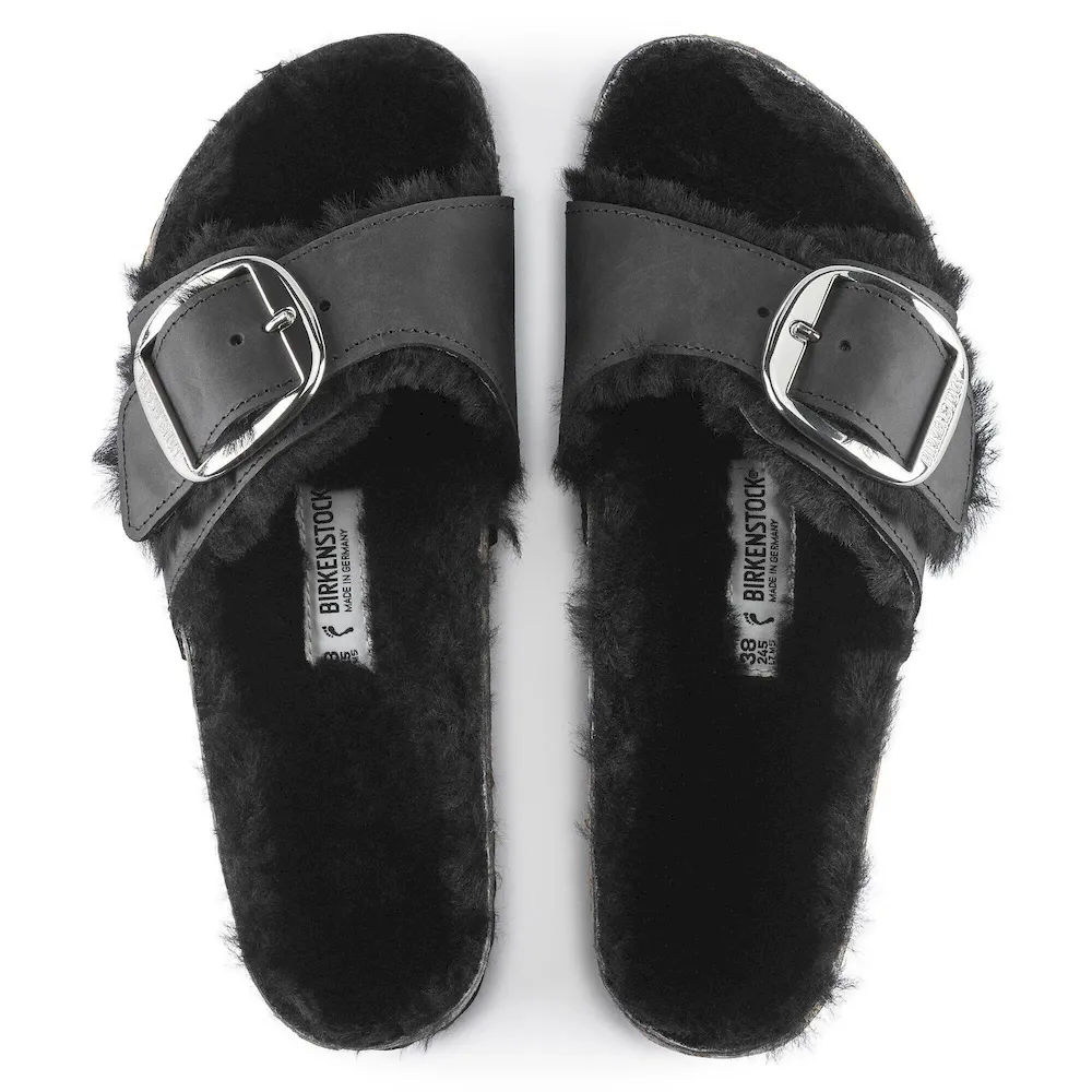 A strap, a buckle and a contoured cork footbed are masterfully combined to create the original Birkenstock sandal – the Madrid. This version is incredibly cozy featuring a color-coordinated genuine shearling lining, shearling lined straps and a big, elegant pin buckle. The upper is a soft yet durable oiled leather.