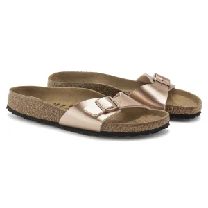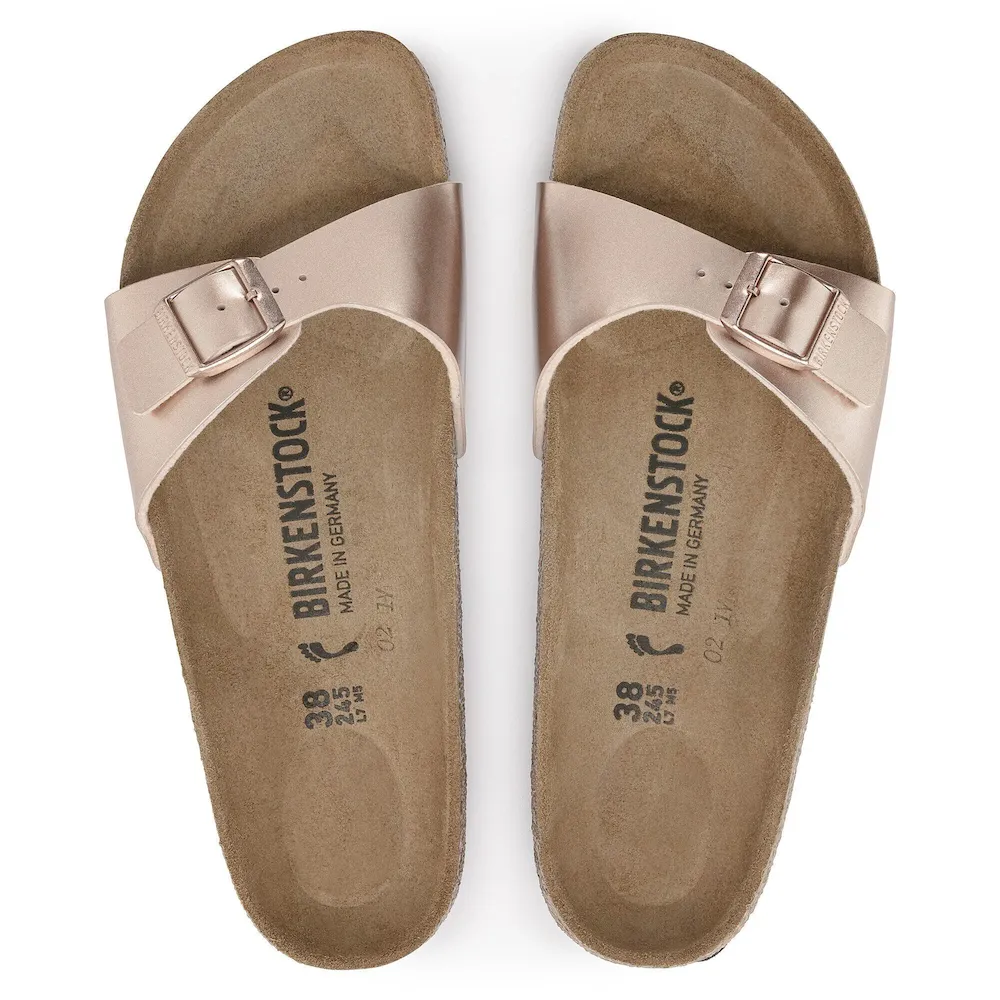 The BIRKENSTOCK Madrid is the oldest member of the family of models, making it a veritable classic. Launched as a “gymnastics sandal” half a century ago, this simple single-strap model has gone on to become a firm fashion favorite. This version features a metallic glossy effect. The upper is made from the skin-friendly, hard-wearing synthetic material Birko-Flor®.