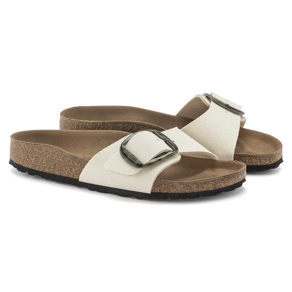 Effortlessly elegant. This season, the iconic Madrid sandal goes vegan with a 100% natural cotton canvas upper. A printed oversized buckle brings the style together with a statement finish. Complete with legendary BIRKENSTOCK design elements, like a contoured cork-latex footbed that shapes to you for custom support.