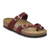The Mayari from BIRKENSTOCK – an elegantly comfortable sandal with adjustable, crisscrossing straps that form a single loop around the toe. Classic support and adjustability, designed beautifully. The color-coordinated outsole and the buckles round off the shoe’s look. The upper is made from high-quality, especially soft nubuck leather.