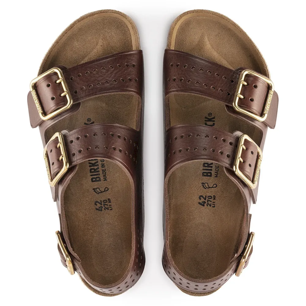 The Milano sandal adds an adjustable backstrap to its classic, two-strap design, giving you more security and a fit that’s just right. This modern version features an upper made from aniline leather complemented by brass buckles for a classic look. This Milano is designed with a unique Rubber Grip outsole for added traction and durablity.