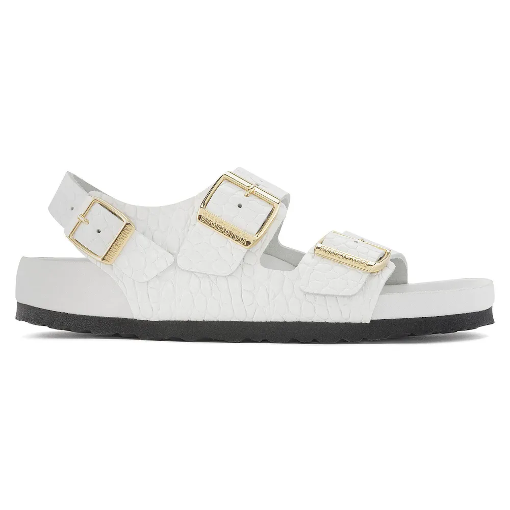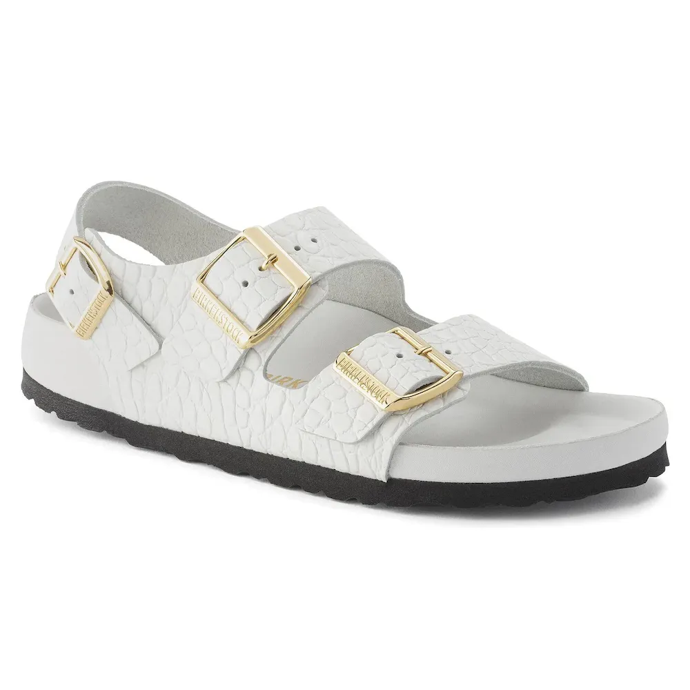 The BIRKENSTOCK Milano now features a reptile leather look and feel and a compact design with an ankle strap. The metal pin buckles are individually adjustable with color-coordinated detailing. The exquisite footbed is fully lined with soft piumato leather, making it exceptionally comfortable. The upper is made from embossed natural leather.