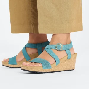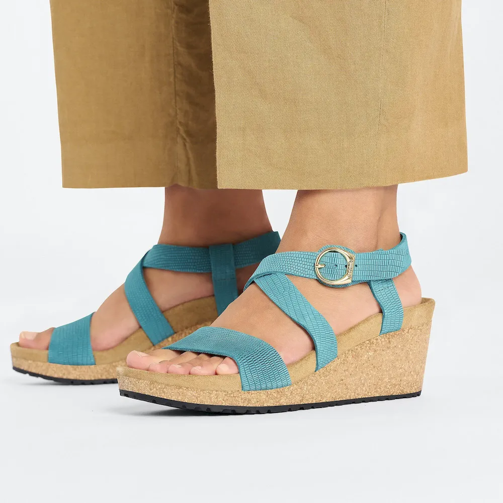 New from Papillio® by BIRKENSTOCK®. The Sibyl wedge levels up with comfort and ease, riding a wave of color that takes inspiration from sea and sky. Embossed leather straps crisscross comfortably across the foot, brought together by an elegant, rounded buckle. Lifted by a classic cork wedge, built around the contoured footbed you love.