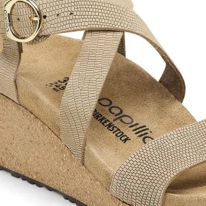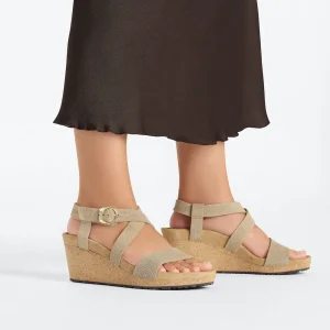 New from Papillio® by BIRKENSTOCK®. The Sibyl wedge levels up with comfort and ease, riding a wave of color that takes inspiration from sea and sky. Embossed leather straps crisscross comfortably across the foot, brought together by an elegant, rounded buckle. Lifted by a classic cork wedge, built around the contoured footbed you love.