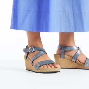 From Papillio® by BIRKENSTOCK®. The Sibyl wedge levels up with comfort and ease, catching eyes as it goes. Metallic leather straps crisscross comfortably across the foot, brought together by a shiny, rounded buckle. Lifted by a classic cork wedge, built around the contoured footbed you love.