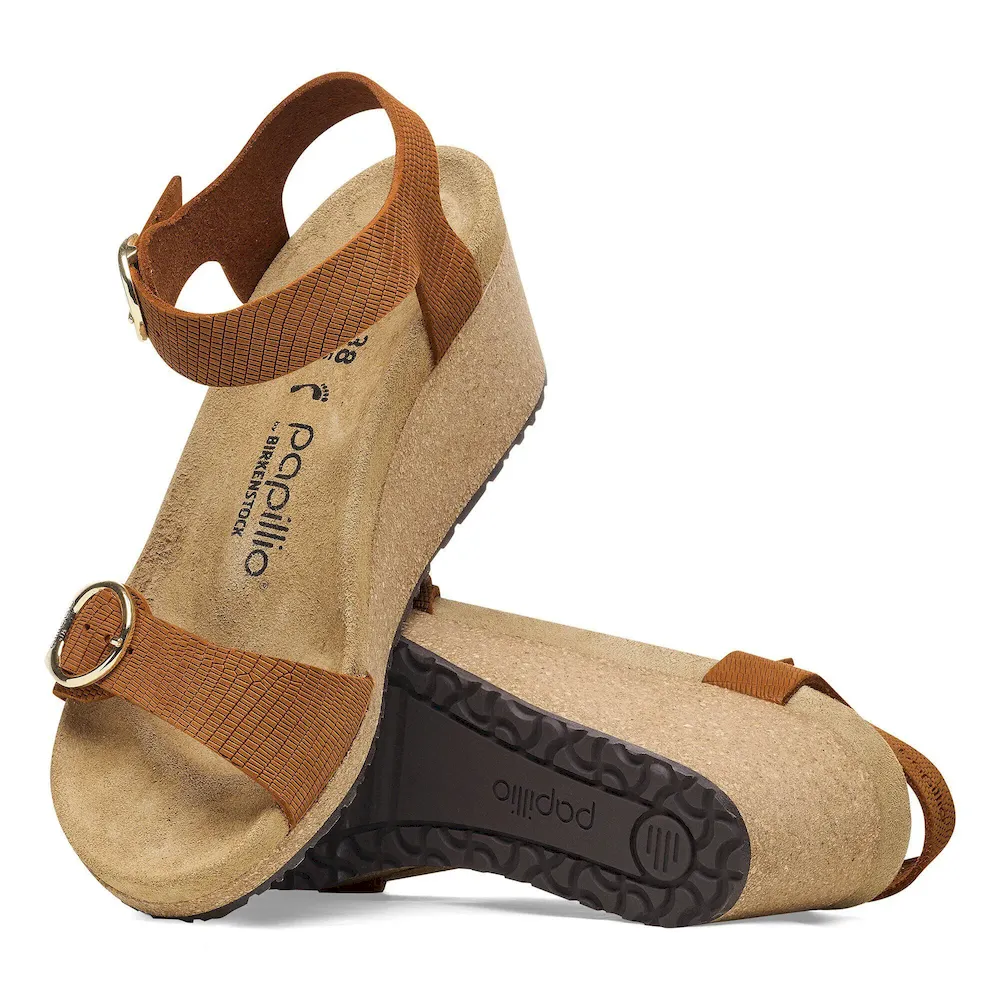 The Soley brings the contoured comforts of the BIRKENSTOCK® footbed together with a cork wedge—designed to level up without adding pressure to the front of your foot. Embossed nubuck leather elevates the details along with elegant, rounded buckles. Level up in comfort.