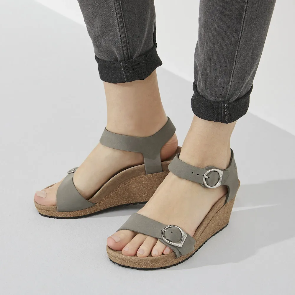 The Soley brings the contoured comforts of the BIRKENSTOCK footbed together with a cork wedge—all without adding pressure to the front of your foot. In softly brushed nubuck leather that comes together with elegant, rounded buckles. Level up in comfort.