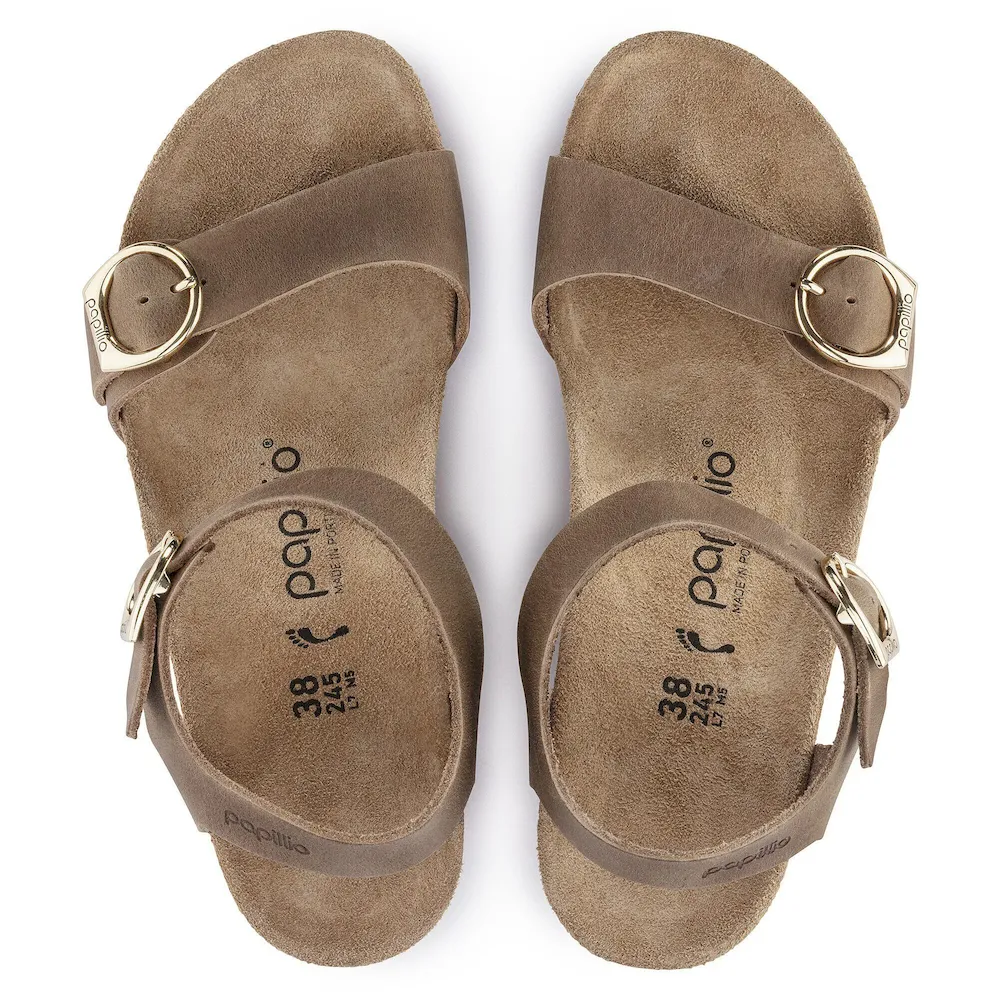 The Soley wedge heel sandal from Papillo is both stylish and comfortable. Featuring an ankle strap and elegant ring buckles for an fashionable yet incredibly comfortable shoe. The upper is made from extra thick, oiled nubuck leather.