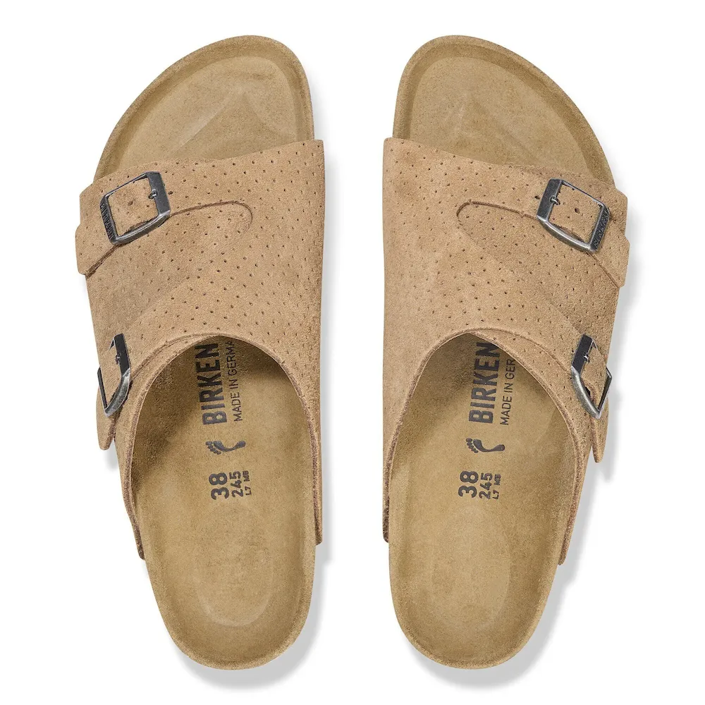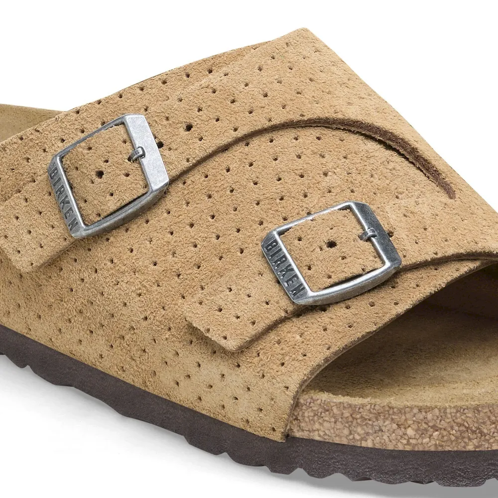 Back by popular demand. The BIRKENSTOCK Zürich returns with its long-loved design, featuring extra coverage and adjustability from two metal pin buckles. This season, dotted suede gives your style new dimension with the material you love most. It all rests on our contoured footbed, designed to shape to you for the ultimate in custom support.